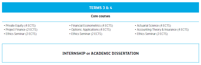 项目介绍 The Master in Finance is a graduate program that is tailored to individual needs and goals. It offers 3 specialized tracks in Corporate Finance, Financial Markets, and Asset Management. The curriculum is flexible and it is full-time during 15 months. The 90 ECTS credits cover courses, an international study trip and an internship or academic dissertation.